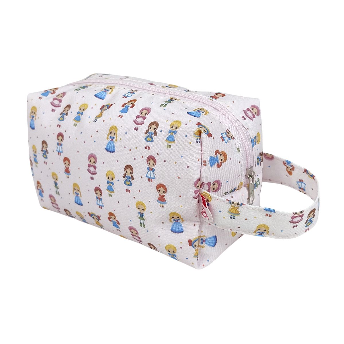 Possui amplo espaço interno com forro resistente, permitindo acomodar itens de higiene, cosméticos, maquiagem ou acessórios com facilidade. O fechamento em zíper garante segurança aos objetos, enquanto o formato estruturado facilita o uso e a visualização do conteúdo.