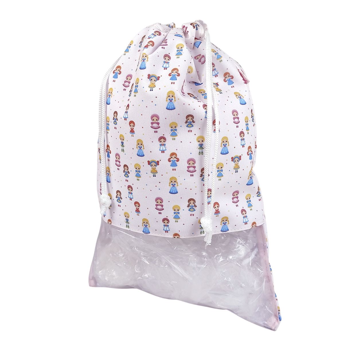 Possui fechamento por corda e uma parte transparente que facilita identificar o conteúdo.