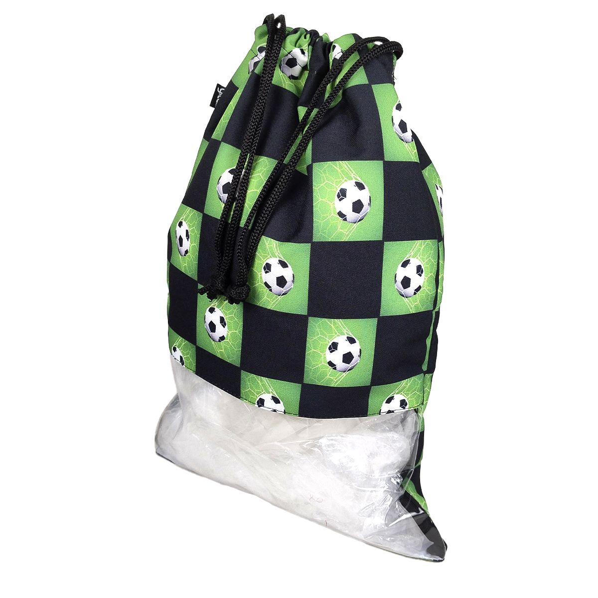 Possui fechamento por corda e uma parte transparente que facilita identificar o conteúdo.